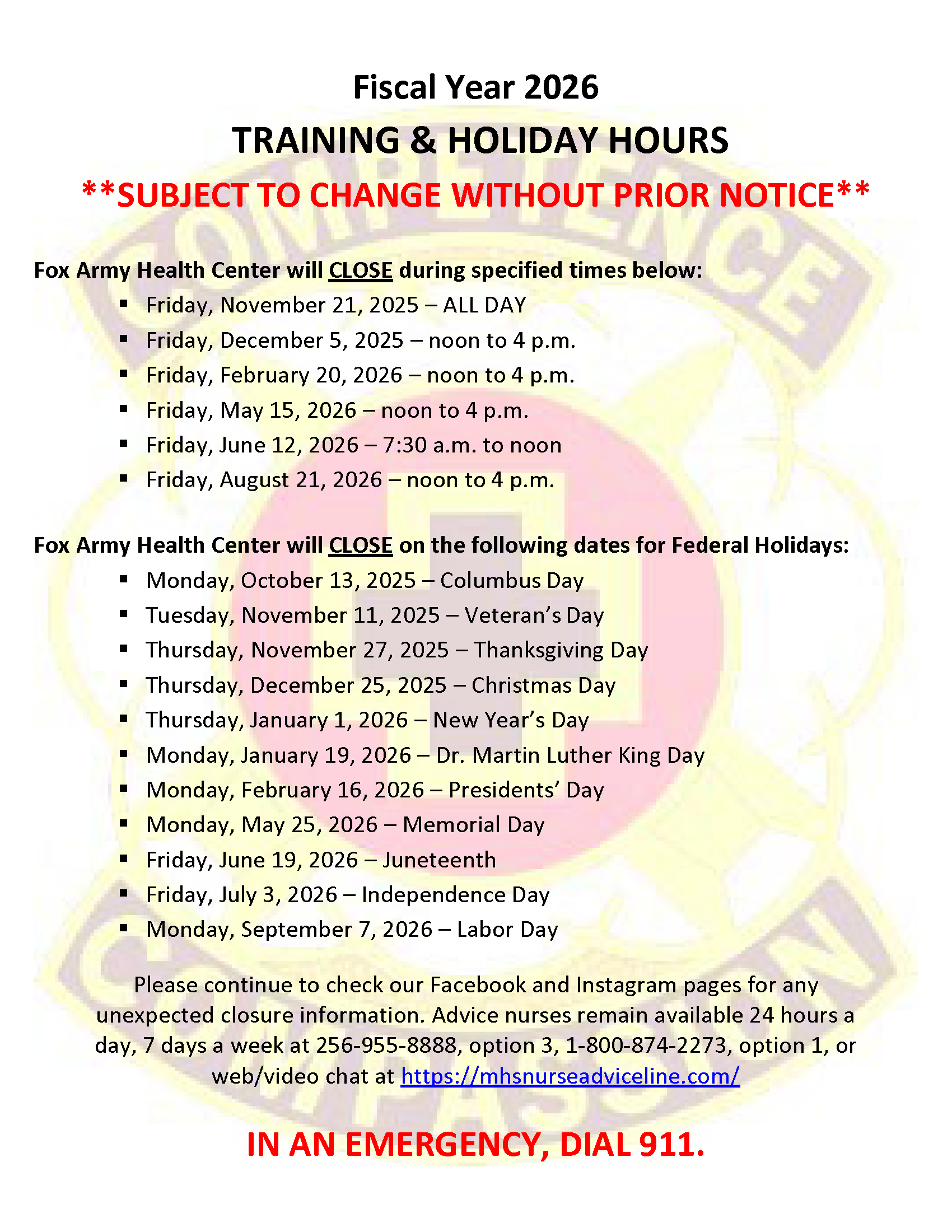 In accordance with the Executive Order published on 18 December 2025, Fox Army Health Center has updated its holiday hours of operation.